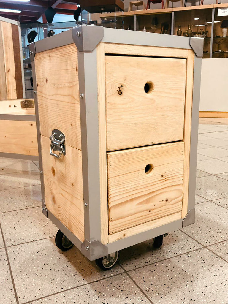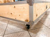 Letto in legno massello in stile INDUSTRIAL, completo di testiera e giroletto con comodini, il tutto realizzato e personalizzato per le esigenze del cliente, che desiderava una camera con ruote piroettanti.