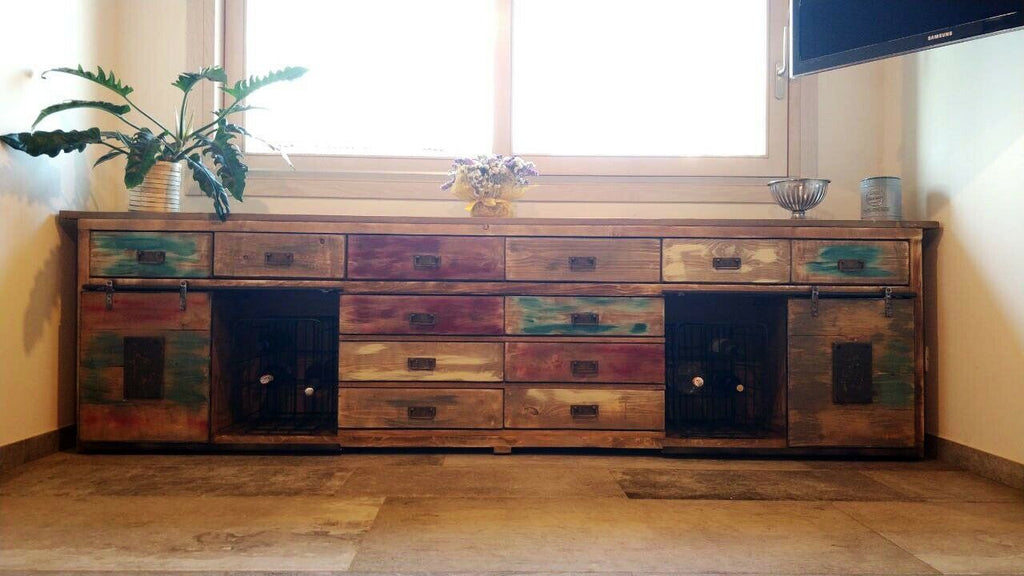 Ampia credenza in stile Industrial, in legno massello (anche da riciclo), tra i quali: castagno, frassino, abete, olmo e in base alla nostra disponibilità.