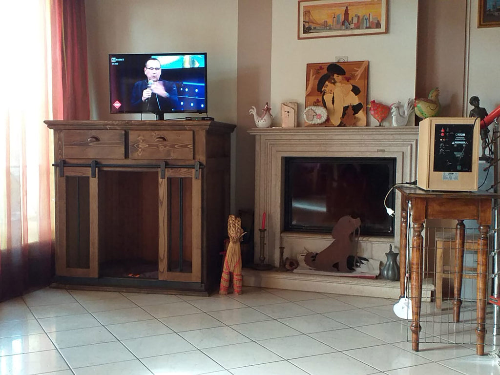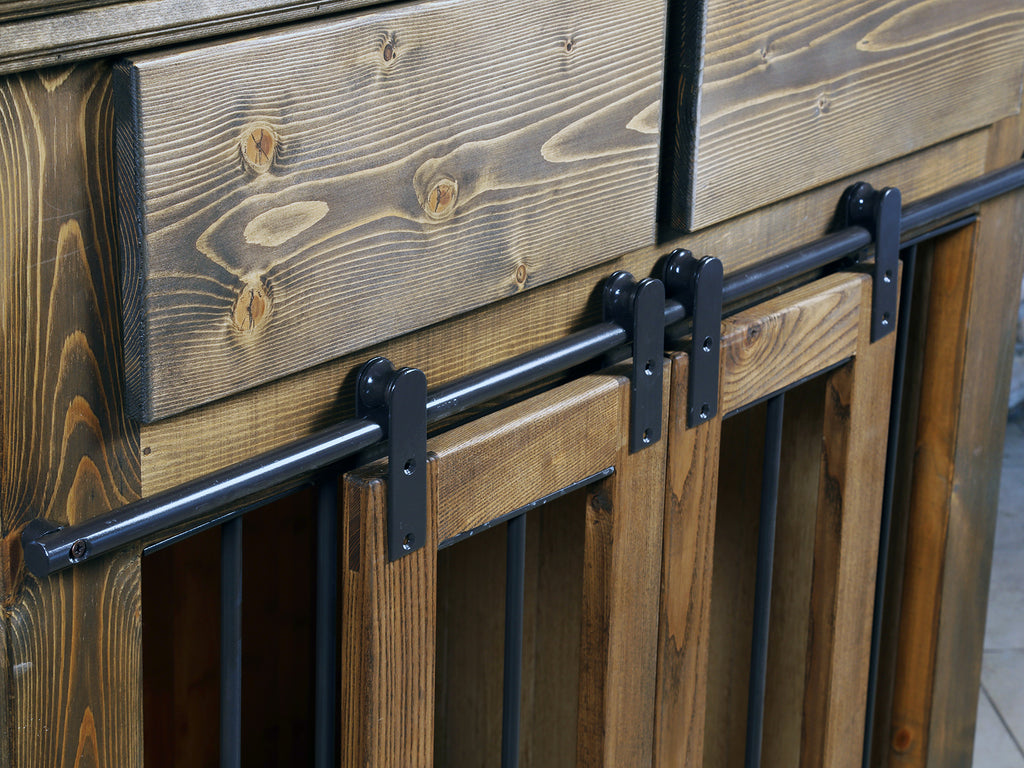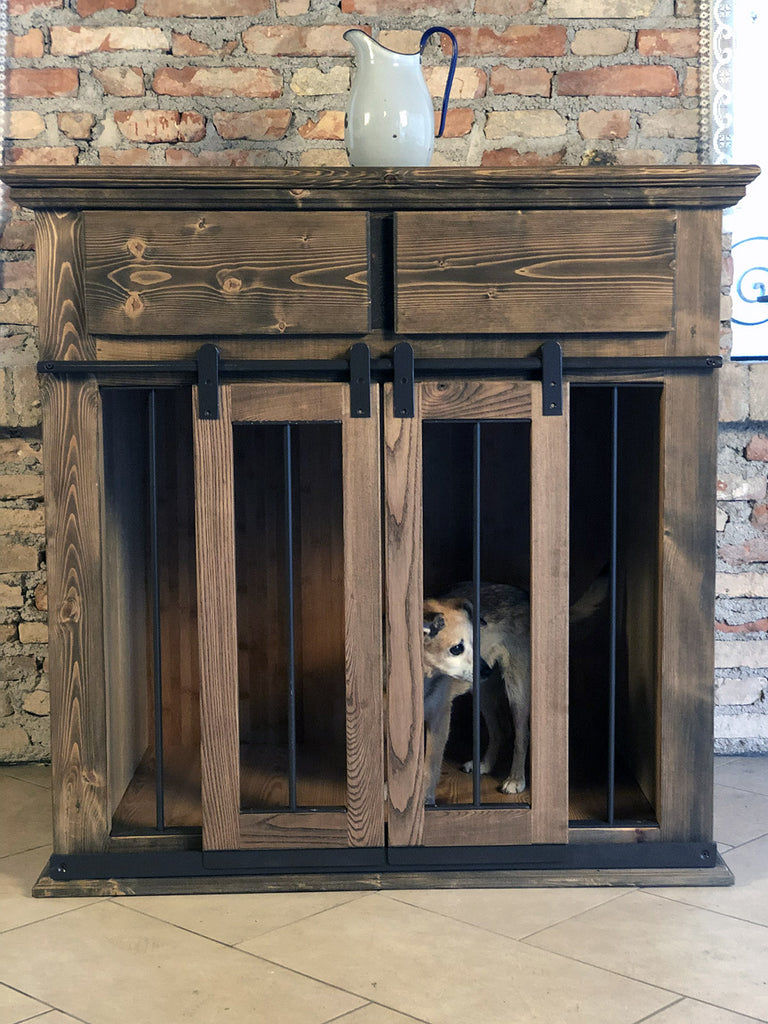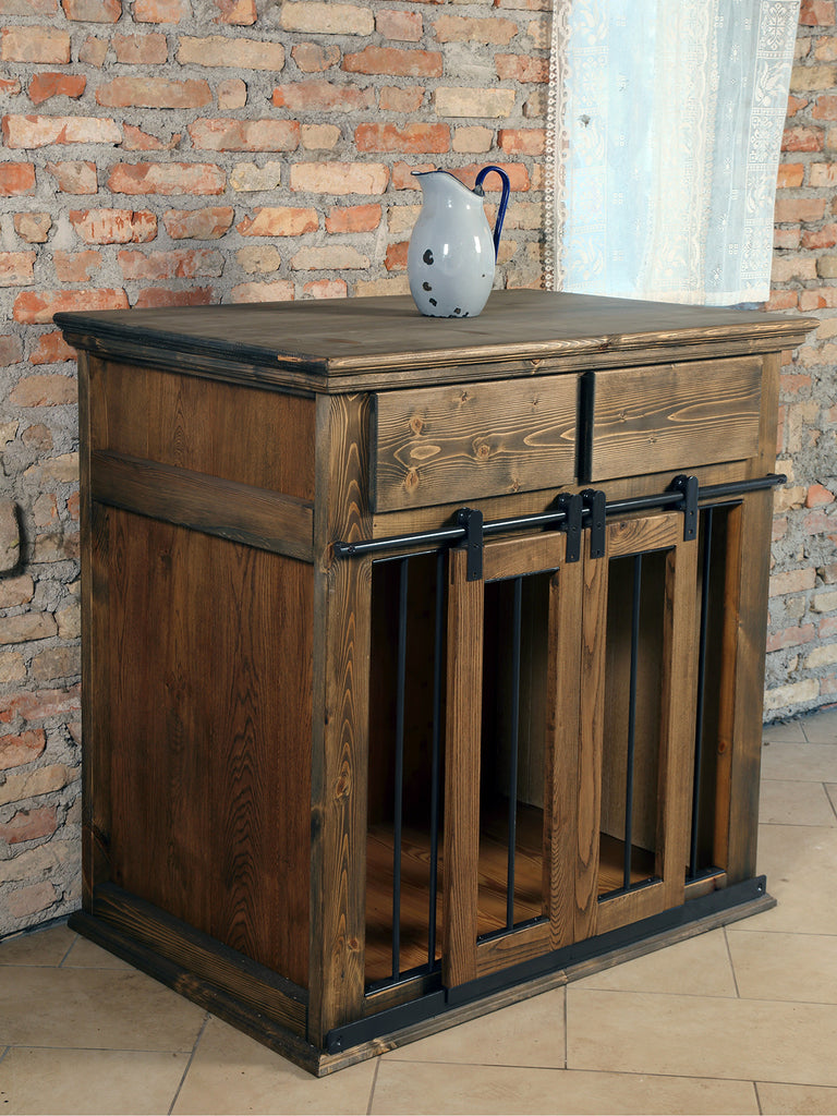 Mobile in legno massello con due cassetti e due porte scorrevoli con vano adibito a cuccia per il cane.