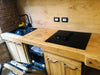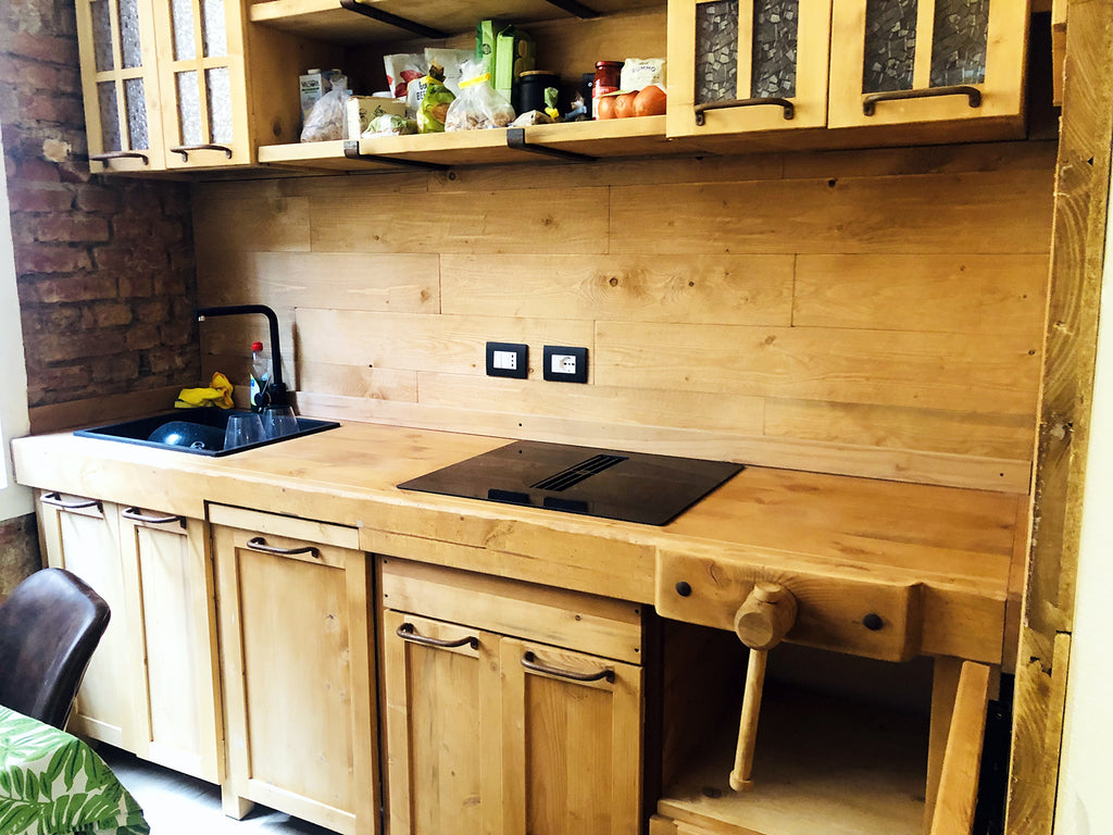 Cucina da realizzare su misura in legno massello con elementi Industrial, con le caratteristiche e similitudini con un banco da falegname ( lunghezza cucina 240x65h85 ), in più colonna attrezzata con incasso per elettrodomestici, due pensili con ante a vetro e due mensole, e rivestimento parete in tavole ad incastro.