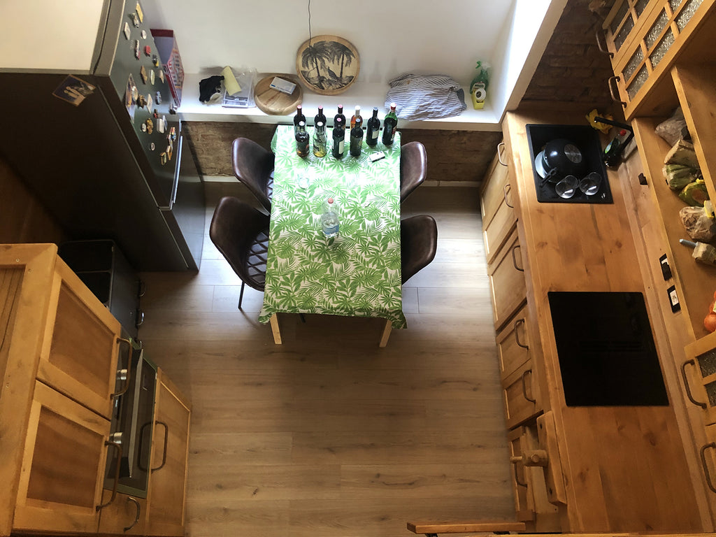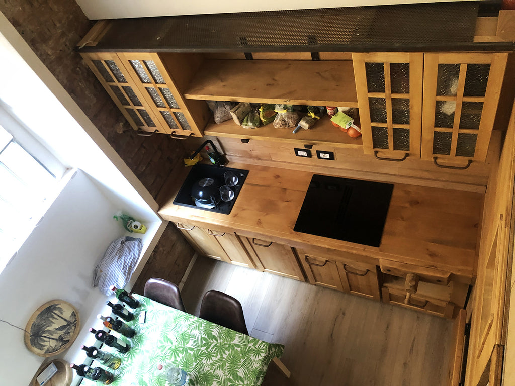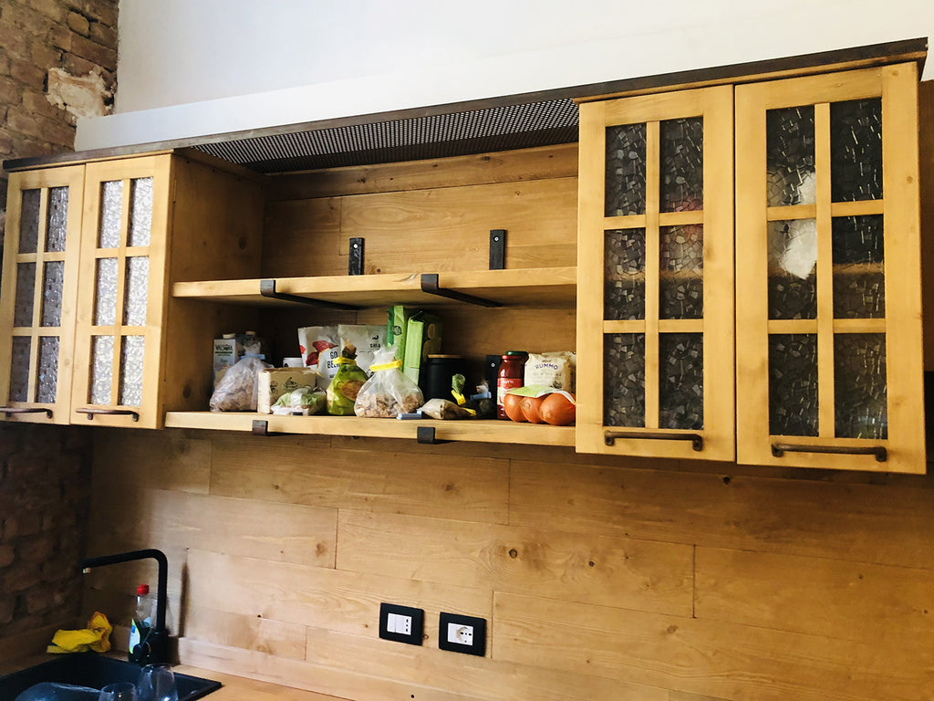 Cucina in stile Industriale / banco falegname con colonna e pensili.