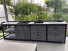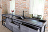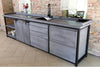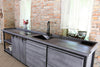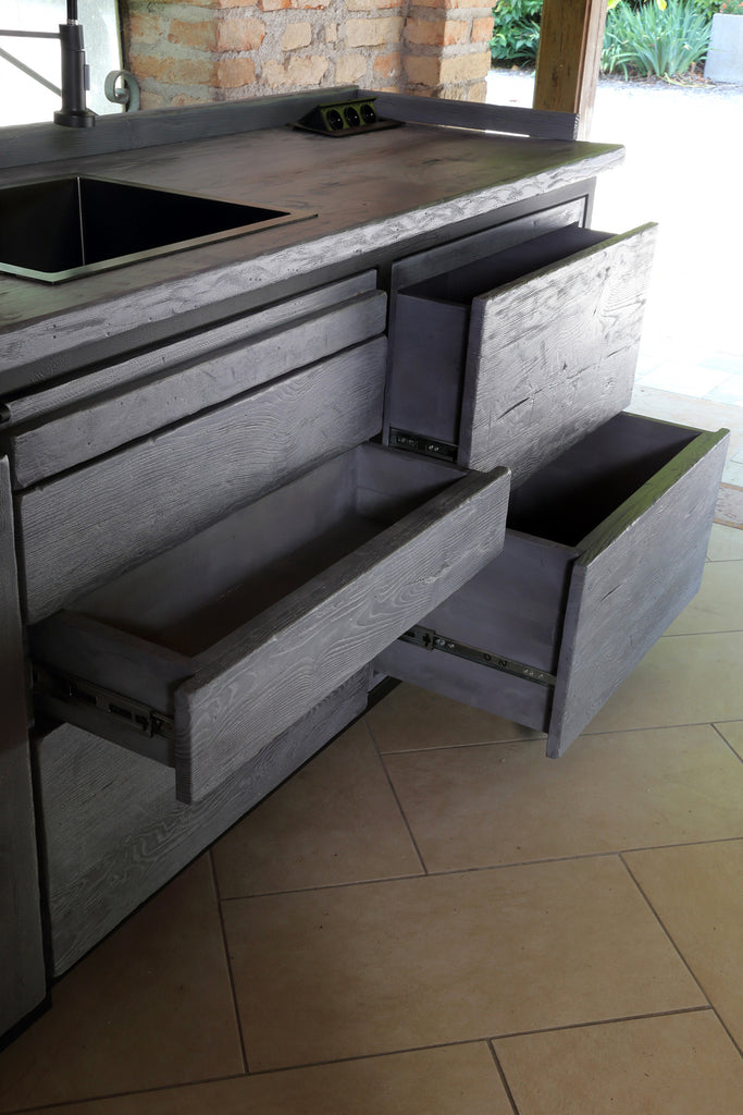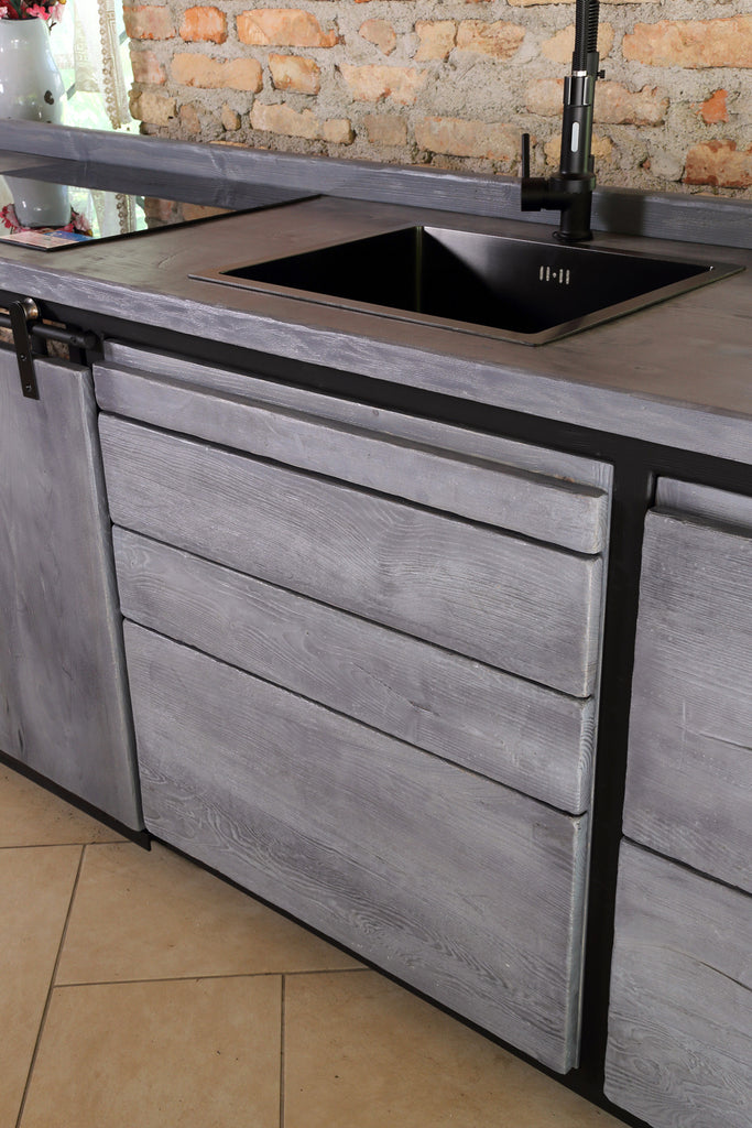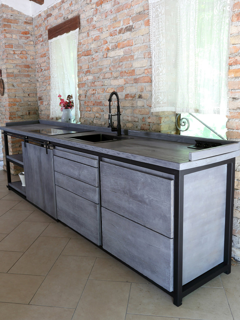 L'abbinamento telaio in ferro e legno massello e la particolare colorazione grigio cemento, conferisce a questa cucina un aspetto e uno stile INDUSTRIAL sobrio e moderno. l'ampio vano a giorno e la grande anta scorrevole da 90 cm posizionata sotto al piano ad induzione non passano inosservati e le due grandi cassettiere da 60 cm la rendono sicuramente molto funzionale, il lavello 45x45 cm in acciaio a semi-filo mantiene una linea pulita nel piano lavoro.