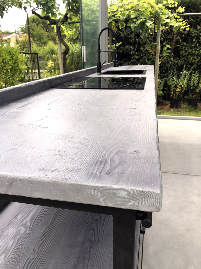 Cucina stile INDUSTRIAL struttura metallica e rivestimenti in legno massello ad effetto cemento.