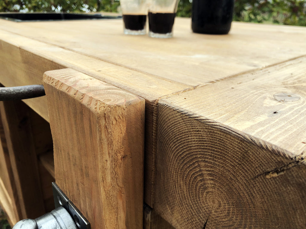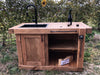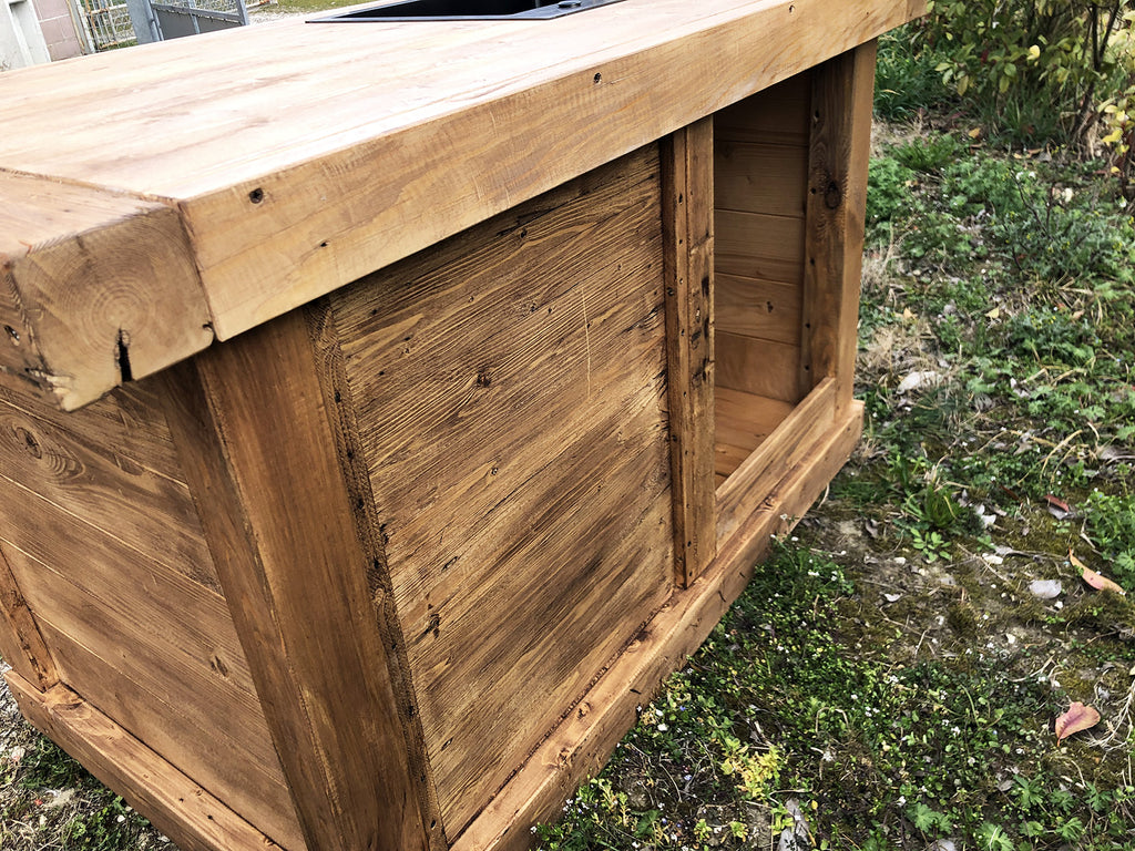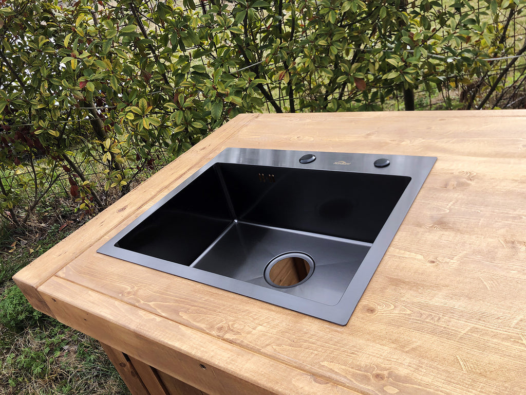 Piccola cucina in stile INDUSTRIAL in legno massello con lavello e miscelatore inclusi, interamente in legno massello e ideale per piccoli ambienti, attività di ristorazione, anche all'aperto.