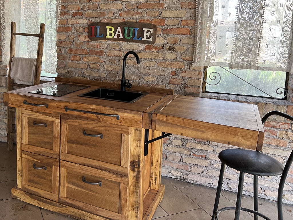 Piccola cucina Rustica in legno massello completa di lavello miscelatore e cottura a due fuochi e piccolo tavolo a ribalta.