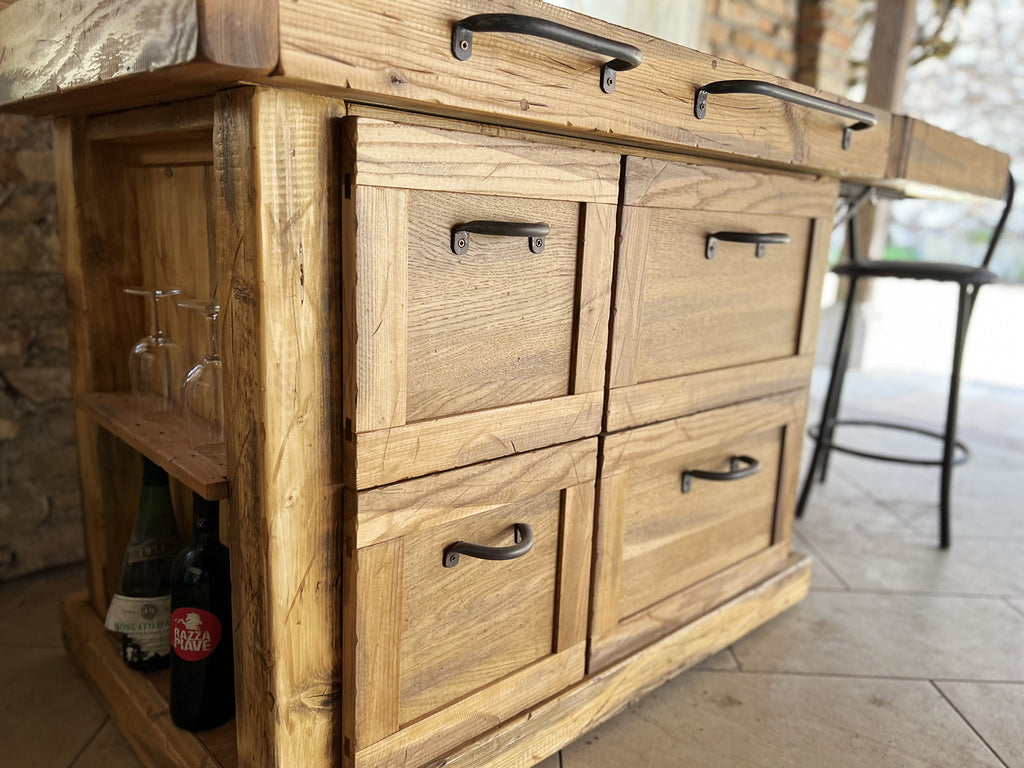 Sono presenti anche quattro comodi cassettoni, due da 40 cm e due da 60 cm e sul fianco sinistro del mobile abbiamo ricavato una piccola nicchia per bottiglie e bicchieri.