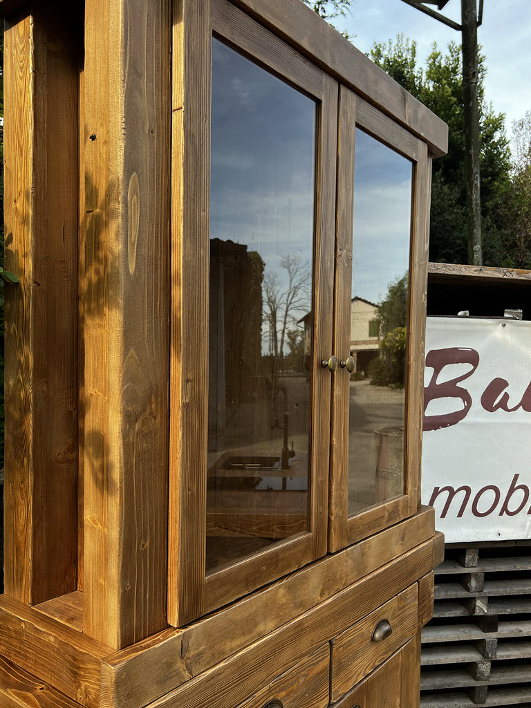 👉 Mobile Vetrina / Credenza OPZIONALE in stile COUNTRY in legno massello, lunghezza 120 cm, profondità base 35 cm, profondità vetrina 30 cm, altezza totale 220 cm.