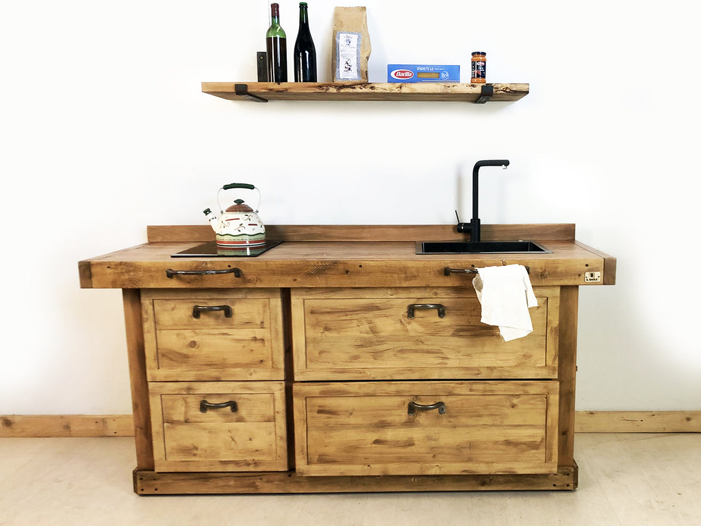 Piccola cucina in stile COUNTRY / INDUSTRIAL in legno massello con lavello e miscelatore inclusi, ideale per piccoli ambienti e ristorazione all'aperto.