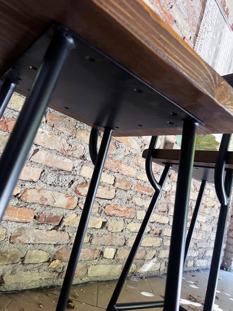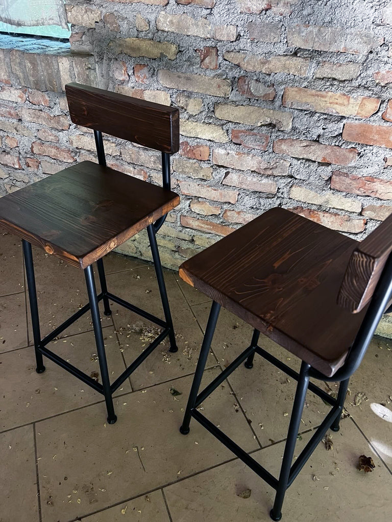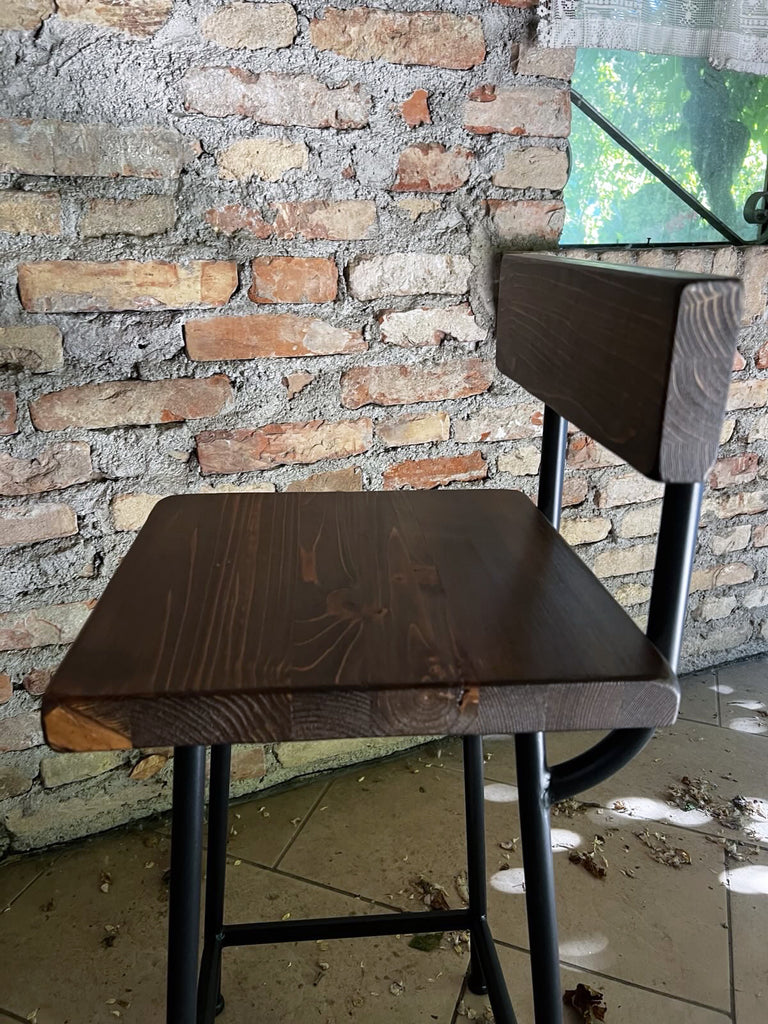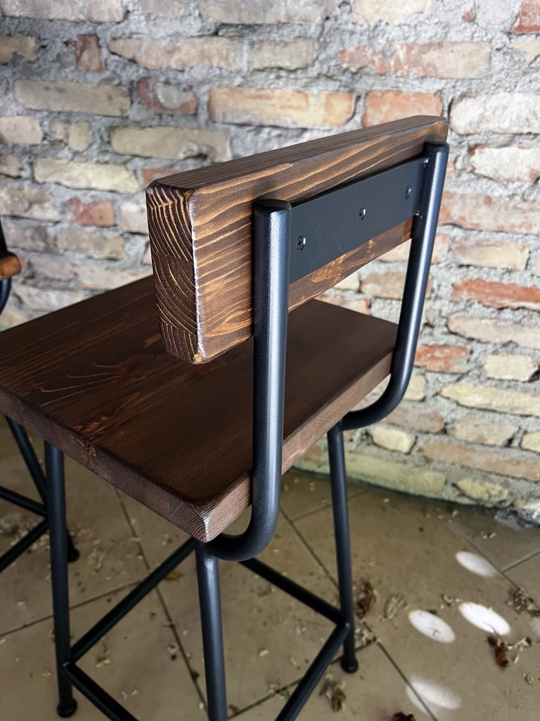 Sgabello alto dal design squadrato in stile industriale, realizzato con struttura in ferro tubolare a sezione circolare (Ø 20 mm), completo di pratico poggiapiedi. La seduta e lo schienale, in legno con finitura noce scuro, offrono un tocco naturale dalle sfumature Country.