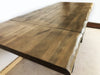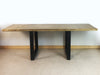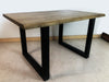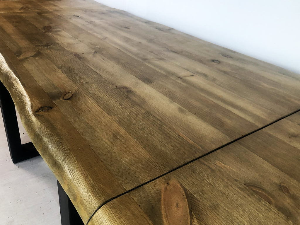 Tavolo fisso con TOP in legno di abete scortecciato e gambe in ferro tubolare a sezione rettangolare saldato a formare un riquadro. La finitura scelta dal cliente è di un noce chiaro e smalto nero per la struttura in ferro.