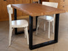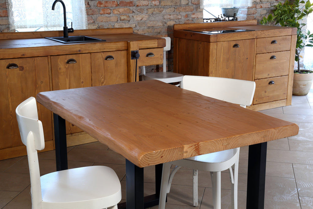 Tavolo da cucina con piano in legno massello e gambe in ferro.