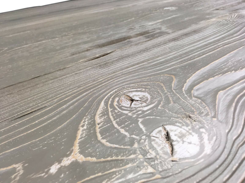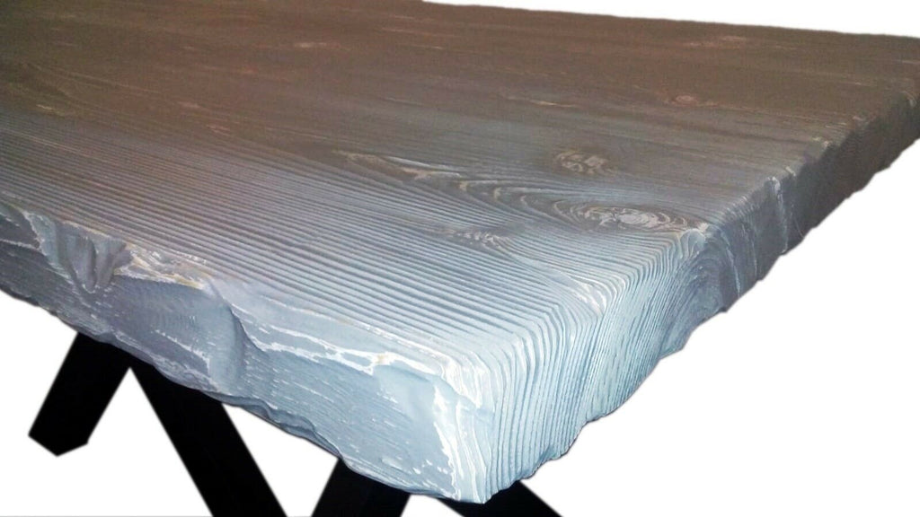 Tavolo in stile Industrial ad effetto cemento, realizzato utilizzato legno massello di abete lavorato a rilievo, particolare lavorazione che consiste nello spazzolare in profondità con apposti macchinari il legno, asportandone le fibre più tenere, ciò che si ottiene è una superfice con la venatura (la parte più dura) in rilievo, a quel punto si tratta il legno con una particolare vernice (colore grigio) che dona al piano quell'effetto cemento, originale e artistico visibile nelle foto; Per un piano così particolare ci volavano delle gambe altrettanto particolari e di Design, opera del nostro fabbro, che ha provveduto a dargli questa forma a crociera e disposte sotto il piano centralmente a "T", la scelta del colore è caduta sul nero, in contrasto con il grigio del TOP.