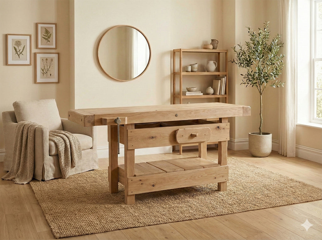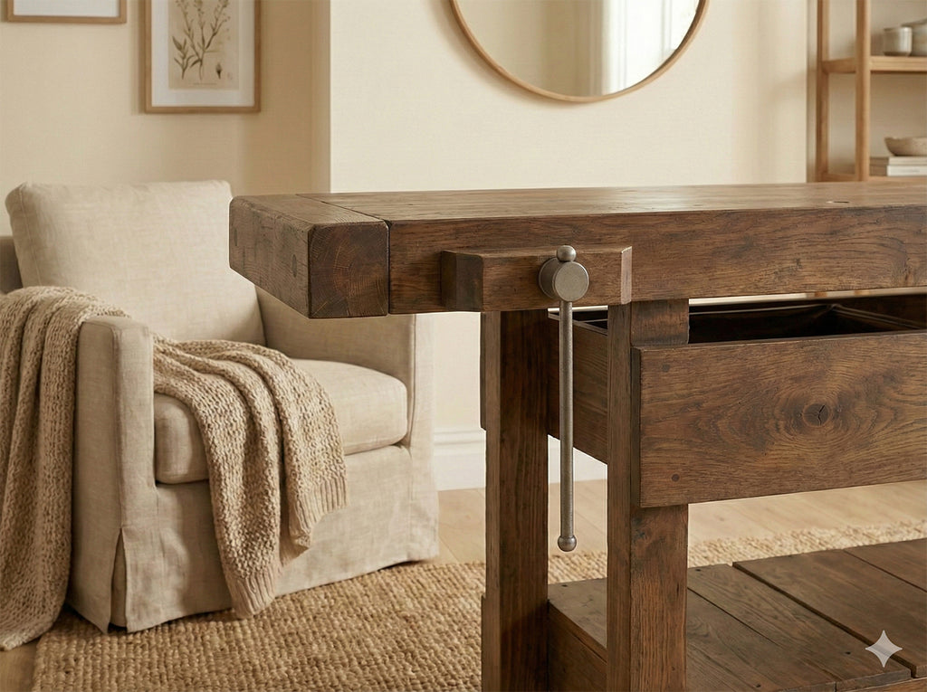 Ein Möbelstück im Stil einer Tischlerwerkbank, komplett aus Massivholz (auch aus Recyclingmaterialien) gefertigt, wurde bewusst grob gearbeitet. Wir wollten die Atmosphäre der guten alten Zeit wieder aufleben lassen und ein schlichtes, unfertiges Möbelstück schaffen, aber vor allem! Wir wollten die Materialien in Szene setzen. Es wurden Hartholzbretter mit massiver Optik verwendet, die schwer zu finden sind. Eine Werkbank mit diesen Eigenschaften zu bauen, ist keine leichte Aufgabe und erfordert eine sorgfältige Materialauswahl.