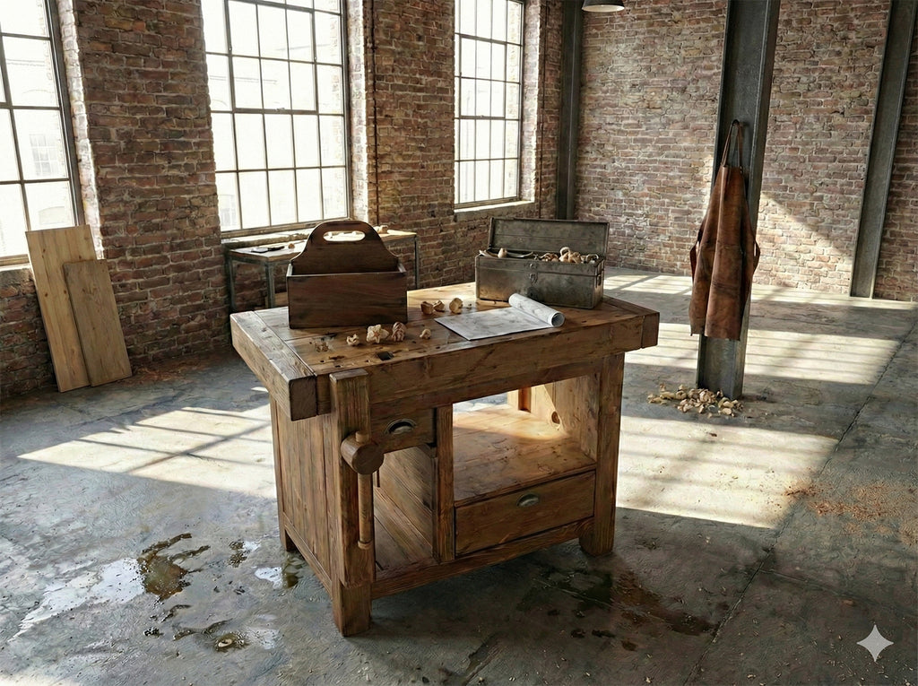 ✅ Alle Größen sind anpassbar, einschließlich Schubladengrößen und -layout. Es kann mehr als einen Schraubstock geben, vorne oder seitlich montiert und aus Eisen oder Holz gefertigt.