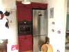 NEOCLASSICAL kitchen in antique red, complete with wall units and column with refrigerator above, made entirely of solid wood.