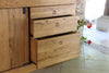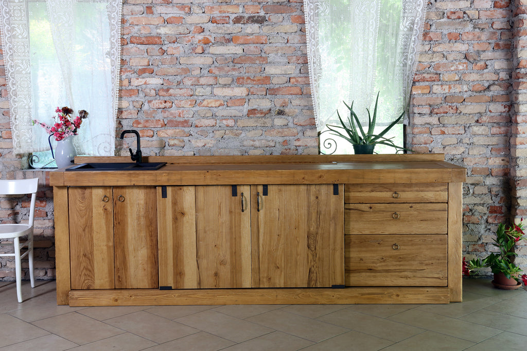 Linear kitchen COUNTRY / INDUSTRIAL, with sink predisposition and without predisposition for appliances, composed of three 60 cm drawers, two 30 cm doors under the sink and two 60 cm central sliding doors, the drawers and doors are made of solid ash, while the plinth, top, backsplash, and hidden parts are made of fir wood or similar. The unusual thickness of the kitchen top (10 cm), recalls the Carpenter's Bench style (Industrial style), while the spartan lines, the ruined effect and the evident irregular bevels of the edges, give it the Country farmhouse look, furthermore to enhance all the beauty of the solid wood the kitchen has been finished with transparent water-based impregnating, a product made with natural and non-toxic resins that gives the surfaces a natural and satin effect.