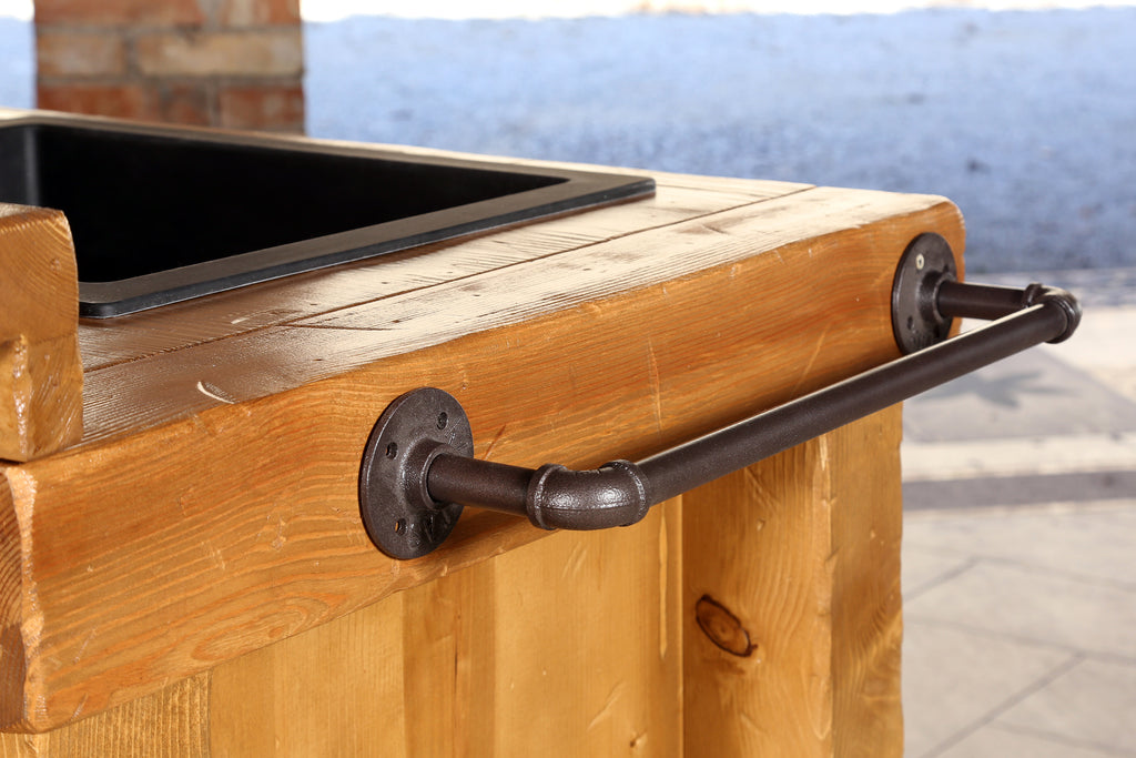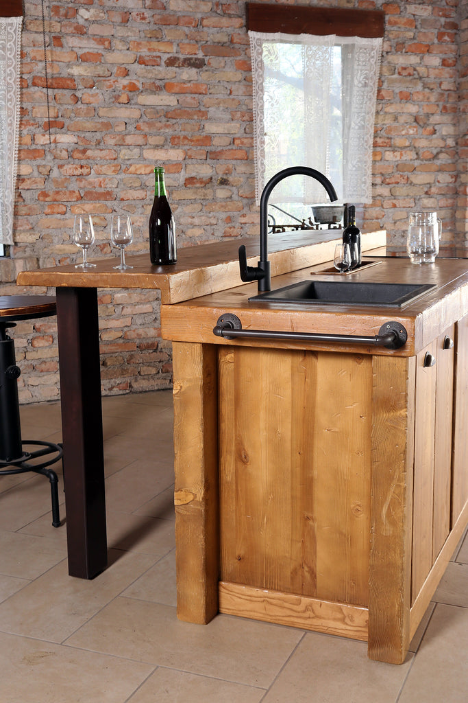 Kitchen Island, designed for a single-bowl sink, hob, and built-in oven, the kitchen island also features a four-drawer chest of drawers. To maximize space, we've added a glass rack and a bottle shelf. We've designed a recessed storage space for a variety of uses in the side of the oven base and in the kitchen countertop. To finish off the look in perfect industrial style, we've crafted a dishcloth holder from metal tubing and attached it to the side of the sink. Our blacksmith also crafted the support legs for the snack table attached to the kitchen island.