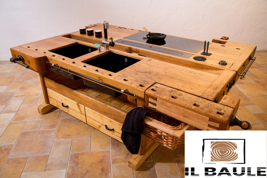We offer an INDUSTRIAL style kitchen island with provision for appliances, consisting of two opposing carpenter's benches, the structure is sturdy and solid, ideal for those who are not satisfied, and are looking for a refined and at the same time functional furniture, our benches are all customizable by the customer, in size, configuration and finish.